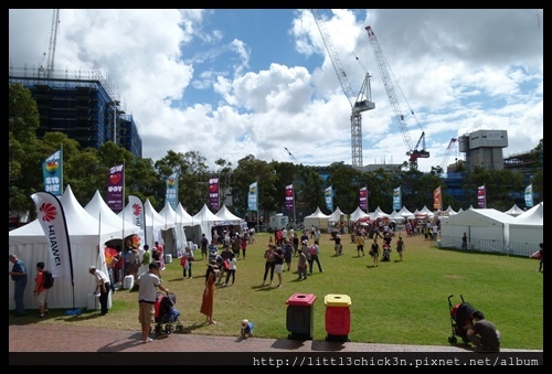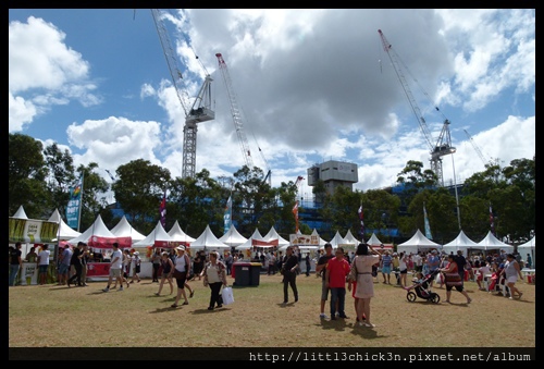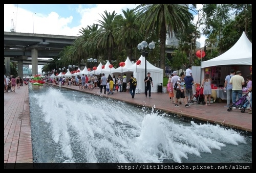 這次的攤位延伸到Tumbalong Park外的小噴泉旁。那一區的攤位都不是賣小吃,大多數跟房地產有關。看到這些房地產攤位,別怪外國人總是把華人跟房地產連想在一起。也別怪外國人總是把高房價的罪狀加諸在華人的頭上。