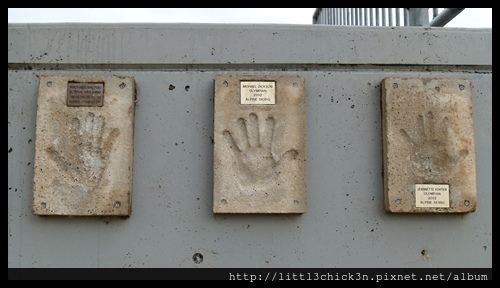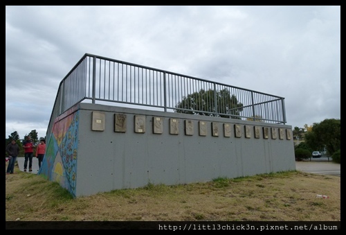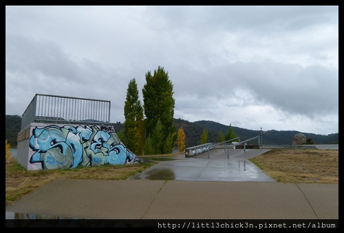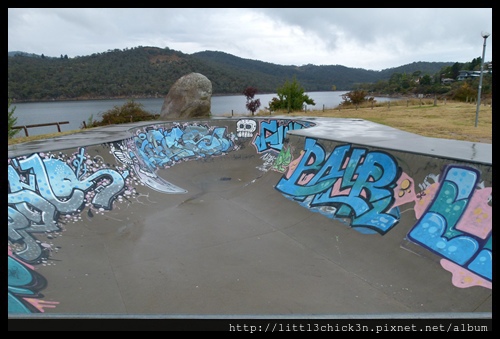 湖邊步道的開端有個玩滑板的設施,與其年輕人在其他公眾地方玩滑板破壞公物,還是建個能讓他們開心玩滑板的設施。其中一個設施的牆上還展示出來自Jindabyne的運動界名人的手掌印。