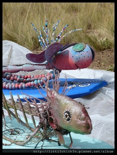 跟著人潮去看雕展,作品不少,七十個應該有。多數作品一看就知是什麼,有的要花一翻功夫去猜。若猜不到,只能去看說明卡了。作品中多數來自藝術家之手,有三個是當地學生的傑作。被展出的這些作品,除了學生的作品外,全都有標上價格,當場賣給有意者,但得在展覽結束後才能拿到手。