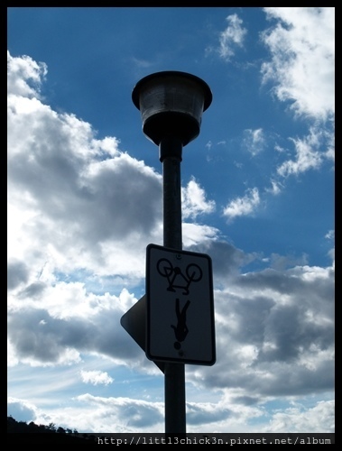 再走下去,前面有個路燈,燈柱上掛有一個標誌。上前近看,哈!怎麼倒過來了呢?難道大家要倒著用手走進去或人跟單車一起倒過來騎進去?原來標誌上面的螺絲掉了。