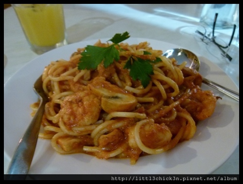 我選不用訂位的那區,本想點彼薩,但又怕連最小盤的都吃不完。還是點一盤簡單的海鮮義大利麵還有果汁。每次點義大利麵總愛點用蕃茄醬煮的麵,眼前這一盤用蕃茄醬跟白醬,雖然看上起不明顯,但味道還是有差。結論是,還是用蕃茄醬煮的比較好吃。