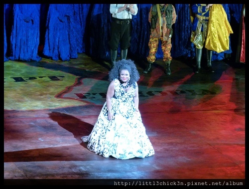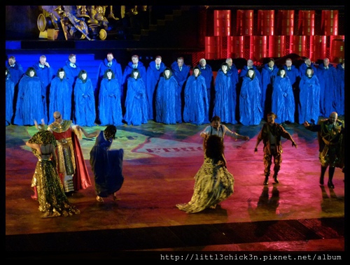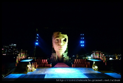 表演期間還冒出幾隻駱駝來載表演者進出舞台,也在舞台背後射放煙火,贏得現場觀眾的讚嘆。在放煙火前那一幕,舞台上那巨大的破眼雕像慢慢轉身,以為會秀出雕像的背部,殊不知秀出完全不一樣的場景,所謂一體兩面啊!