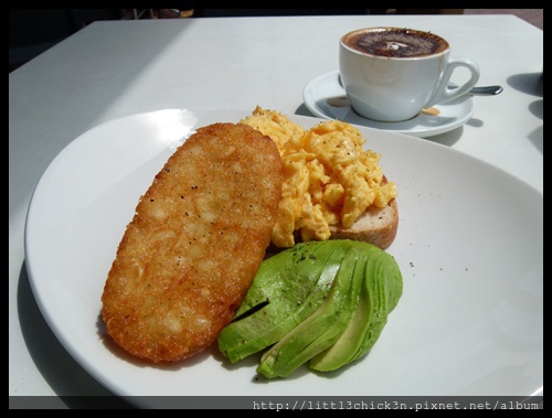 我在每一家餐廳外來來回回不知走了多少次,差點把每一家的早餐菜單背熟,還是無法夬定要吃哪一家的。再不決定,這早午餐會變成下午茶了。最後總算做了個決定,走進Blue Fish這家餐廳,選了個戶外座位,跟服務生點了一組美味早餐跟咖啡。