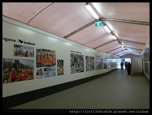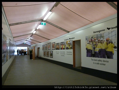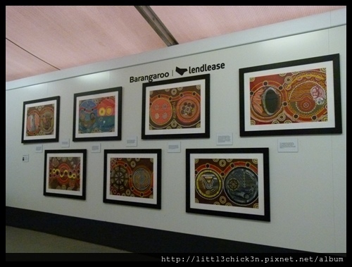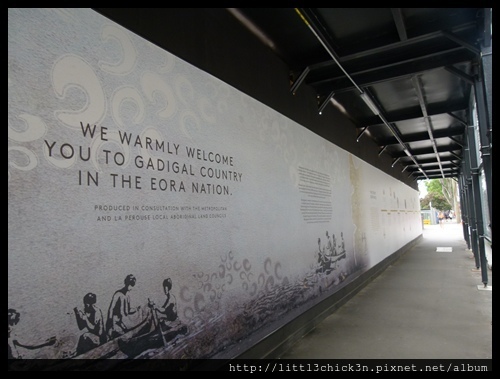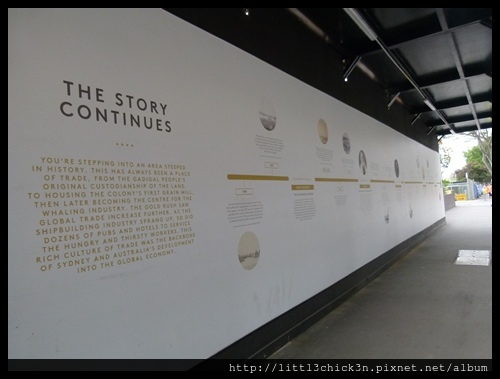 雖然Barangaroo還在施工,但在人行道上有不少說明板介紹Barangaroo。到後來乾脆設了個小展覽室來介紹這工程跟土著畫作。Barangaroo其實是一位重要土著女領導人的名字。當雪梨尚未被歐洲人佔滿前,這裏是Gadigal土著民族生活的地方,在現在的Barangaroo一帶進行補魚及打獵等活動。但隨著搬來雪梨的歐洲人越來越多,雪梨也漸漸成了一個重要港口,為這城市帶來不少商機。