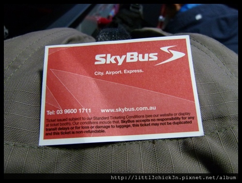 拿了行李,從墨爾本機場第一航廈出去,前面就是SkyBus的售票亭。買完票排隊等車不到幾分鐘車子就來了。車上前半部都是放行李區,乘客要到後面坐。二姊打來查勤,因她要到車站接我,要算準時間出門。