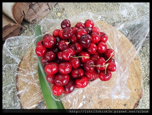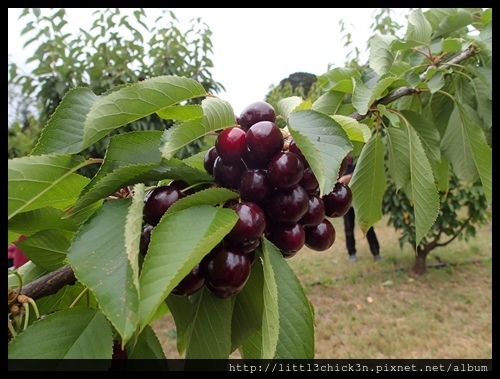 走進農場,前面有工作人員賣盒子。我們買中尺寸的盒子後便往農場走,穿梭在櫻桃樹之間。眼前頭上都是又肥又紅的櫻桃粒,有的很大有的比較小,而我們,想當然而,只摘大粒的~哈哈哈!