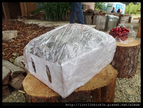 走到剛剛買盒子的地方,那裏有一大盒的保鮮模給大家包我們的戰利品。一整排遊客在那裏輪流包著。包完手上這兩盒,走回我們的車,外甥女可能太過興奮,走路時不小心跌了一跤,兩個大人手上抱著櫻桃跟野餐用品一時反應不過來没即時抓住她。結果小人兒整個人著地,膝蓋破了皮也流血了。但她也没哭,只喊痛,我們趕緊開車送她回家處理傷口。高高興興地出門,怎麼回去時就發生這樣的悲劇呢?