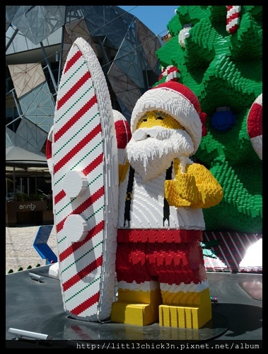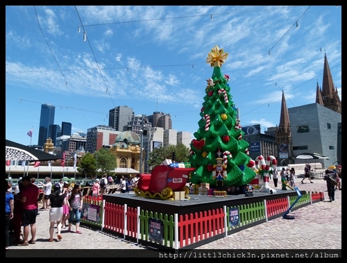 這天跟二姊一家約好一起去吃聖誕大餐,中午約在Flinders Street火車站前見。我到的比較早,先去對面的Federation Square(聯邦廣場)殺時間。最近發現墨爾本人常稱聯邦廣場為Fed Square,而非它的全名,這樣稱呼好像比較省事,舌頭也不會打結了。聖誕節期間這裏正在展示一棵樂高聖誕樹,晚上還會點燈,免費給大眾前往參觀。