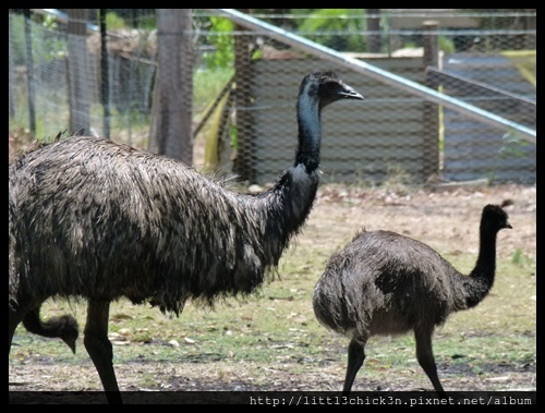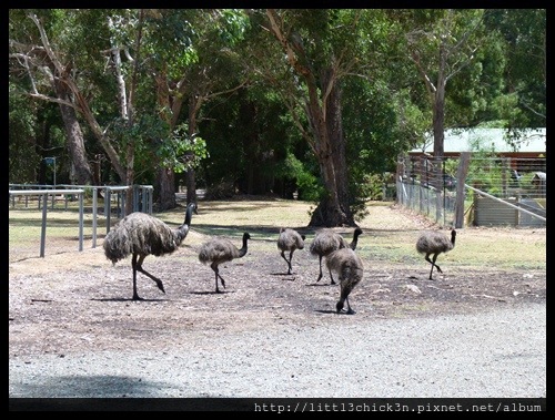 大家都站著邊吃東西邊聊天,Jono突然看著前面說有外來客。大家轉頭一看,有emu耶!等一下,是emu還是ostrich呢?這兩個動物長的超像,常常搞錯。大家拿著相機慢慢向他們靠近,但這些外來客走路超快,一下子就躲進樹林裏。