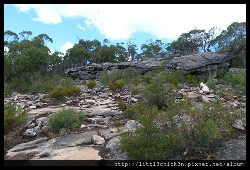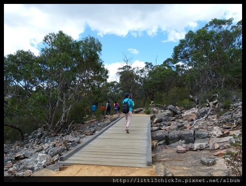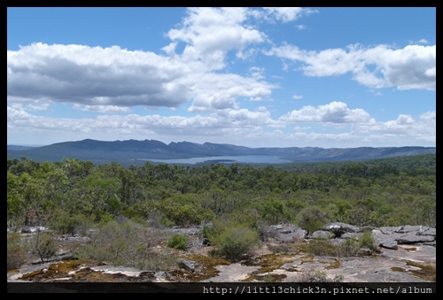 停車場旁有一個步道Balconies walking track,我們向前走到另一個觀景台Balconies Lookout。步道兩旁一邊滿是石頭,另一邊是樹林,延伸到遠處的小湖。