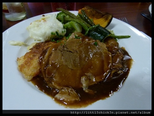 大家看著菜單看了半天都不是很懂,也許對澳洲當地料理不是很熟悉,不太知道要點什麼。我看很多道菜會是很大份量,有的又不是很健康。最後選擇烤豬肉配烤青菜,再點一瓶我最愛的水果啤酒。把這啤酒給日本團員試喝,他們也愛上了,紛紛跑去點一瓶。
