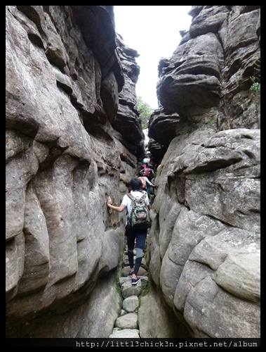 開始走囉!大家一前一後緊跟在領隊身後,為了不擋路,我都走在最後面,放便拍照。整條路還算好走,腳踏在石頭上的次數近乎98%,所以下雨天很容易滑倒。上坡路段,有時有階梯,有時没有。沿途四周,全是峽谷,樹林都在峽谷外圍。有時我們要走在很狹窄的步道,感覺快被左右兩旁的峽谷擠扁成人肉餅。體形較大的人或背著大背包走這一段時要耐著心慢慢來,小心被卡住。