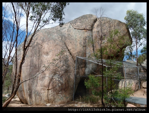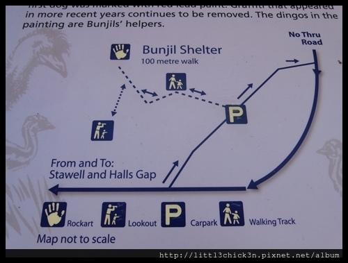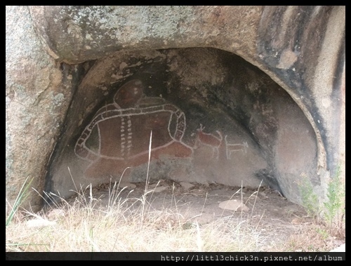 離Stawell小鎮南邊不遠處,車子慢慢駛進公路邊一個小小停車場,大家再徒步進去。就在超大一個長的像大象的石頭下架了個鐵絲網,而石頭下那個洞裏就是那幅鮮明的土著壁畫所在地。圖中有一個人跟兩隻dingo狗,那個人就是被大家看作是神的Bunjil。